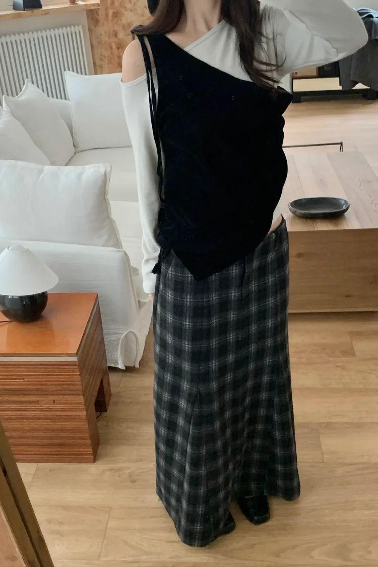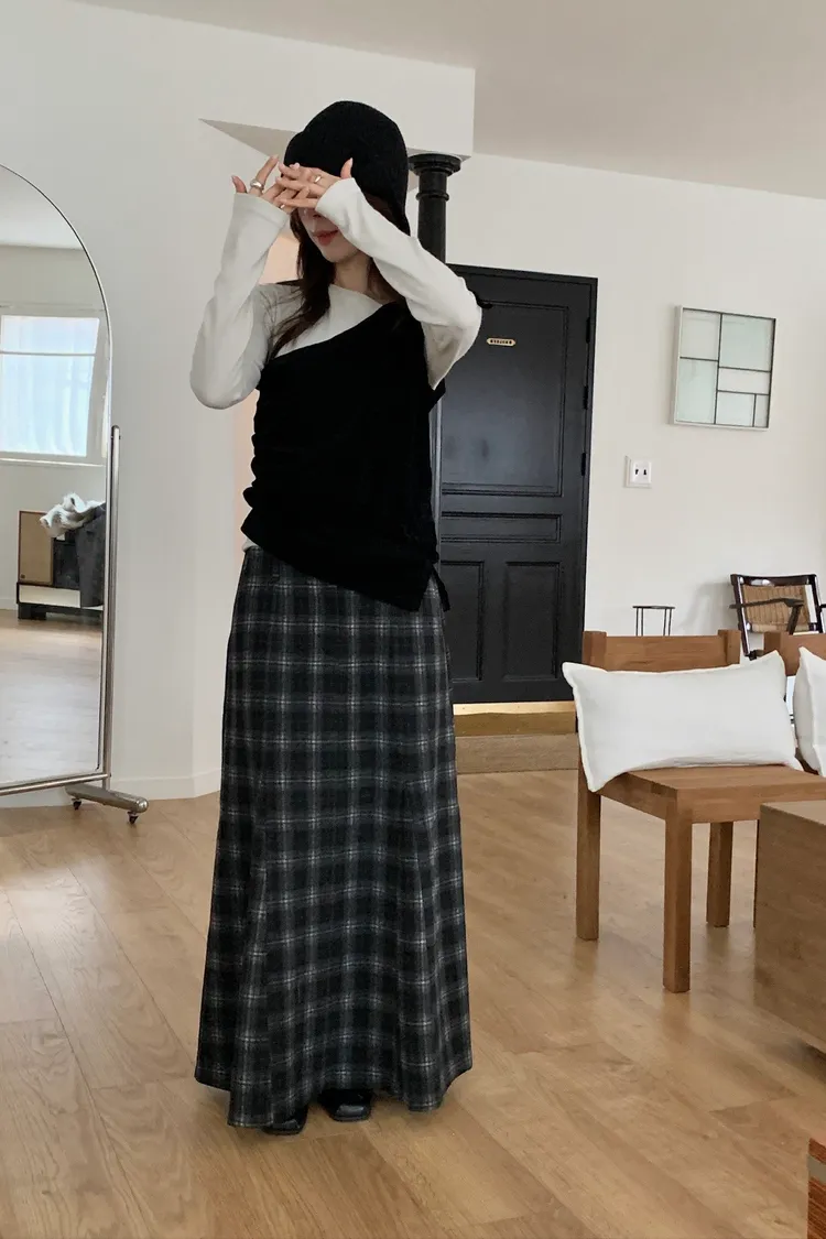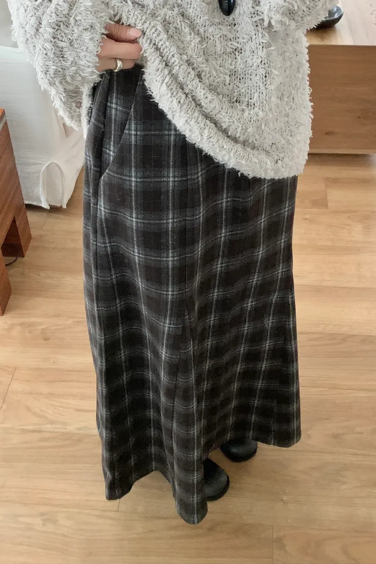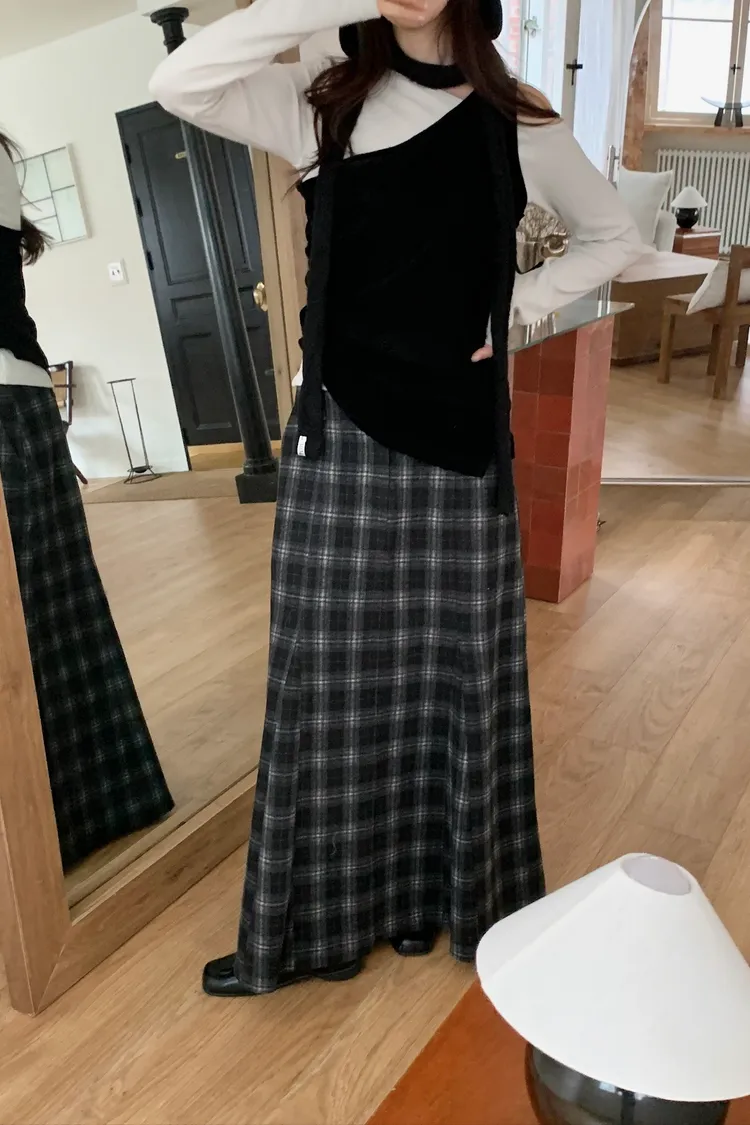 剪裁格紋毛呢長裙