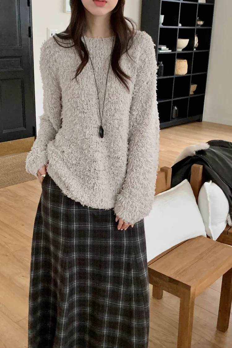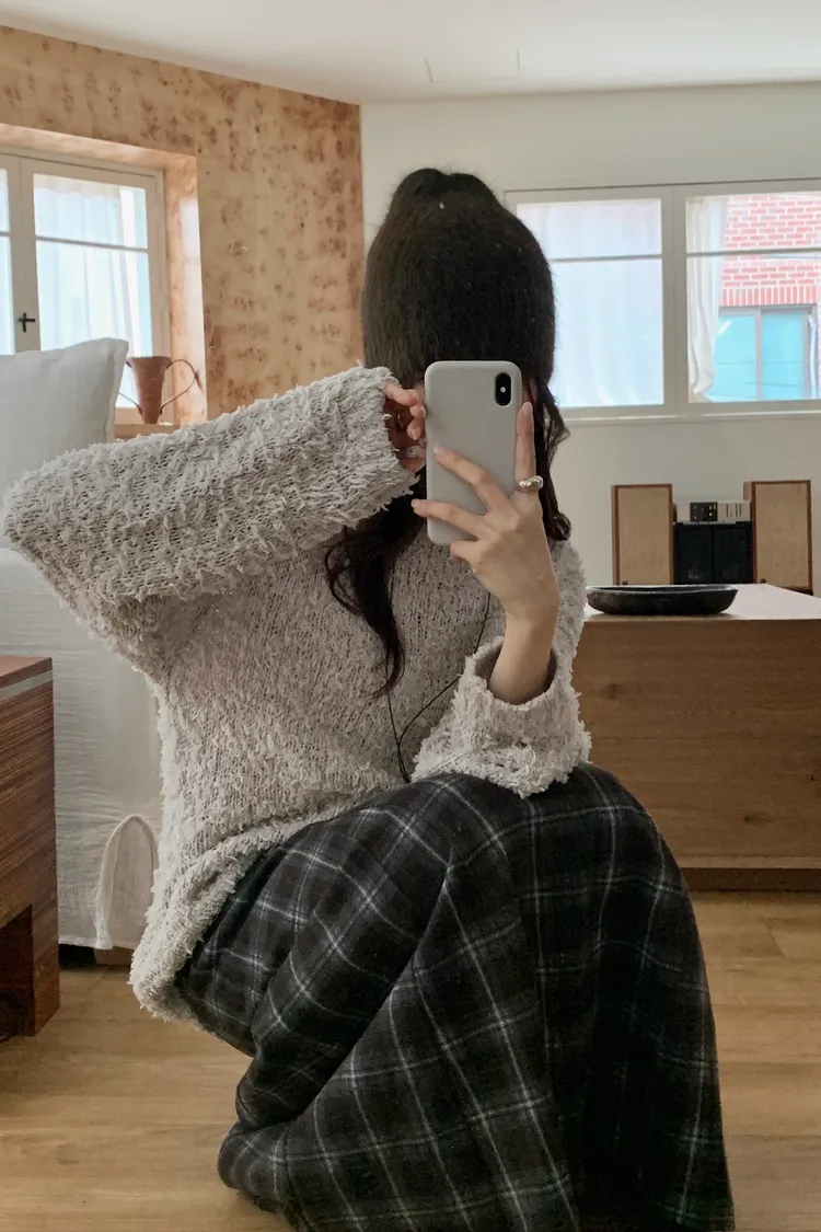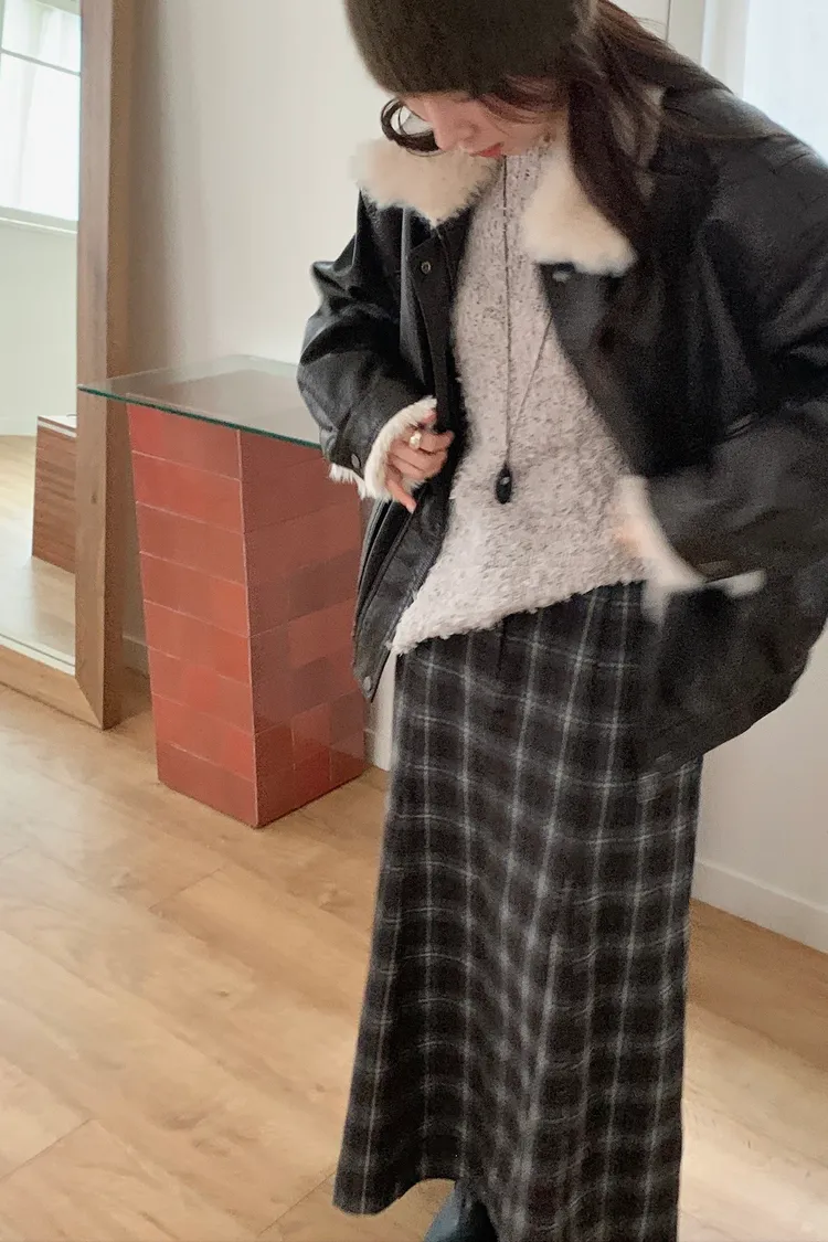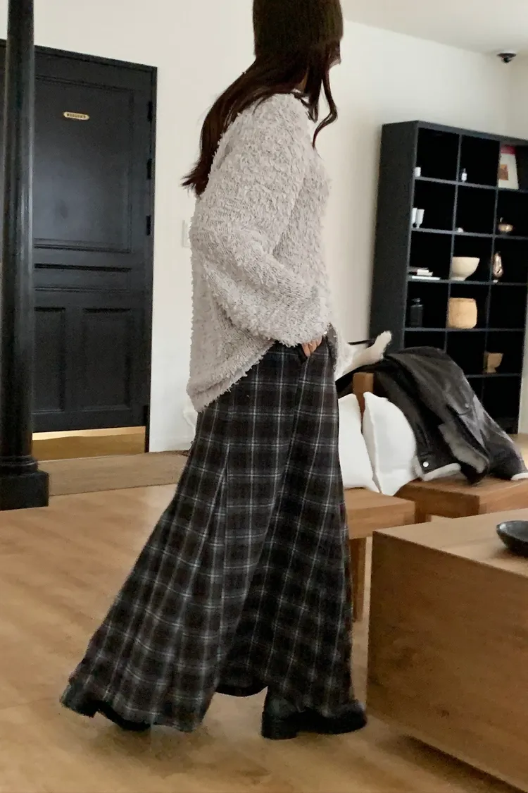 剪裁格紋毛呢長裙